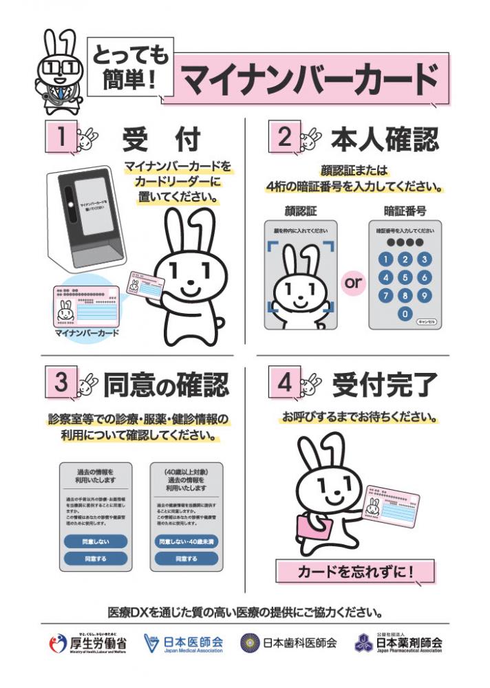 当院ではマイナンバーカードが健康保険証として使用できオンライン資格確認を行っております。オンライン資格確認システムを利用し、患者さんが同意すれば、他院の受診歴や他院で処方されている薬剤情報、特定検診の情報等を活用して診療することができます。 体制の整備に伴いまして、医療情報取得加算を算定しています。